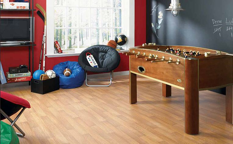 Laminate looks like hardwood, but it’s practically indestructible. It’s scratch-resistant, moisture-resistant, and general wear and tear-resistant. Plus, it’s easy to clean—all you need is a mop and a broom. It’s another great option for kids with allergies and can be accented with an area rug to further personalize your look. Laminate comes in a variety of wood and tile patterns, so the possibilities are almost endless.